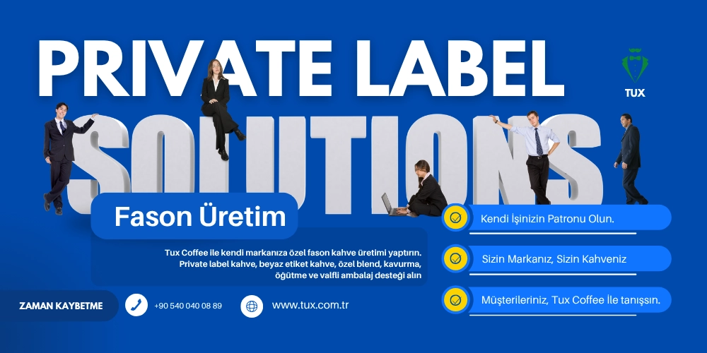 Tux Coffee ile private label kahve üretimi yaptırarak ürününüzü kendi logonuzla, kendi ambalajınızla ve kendi satış stratejinizle pazara sunabilirsiniz.