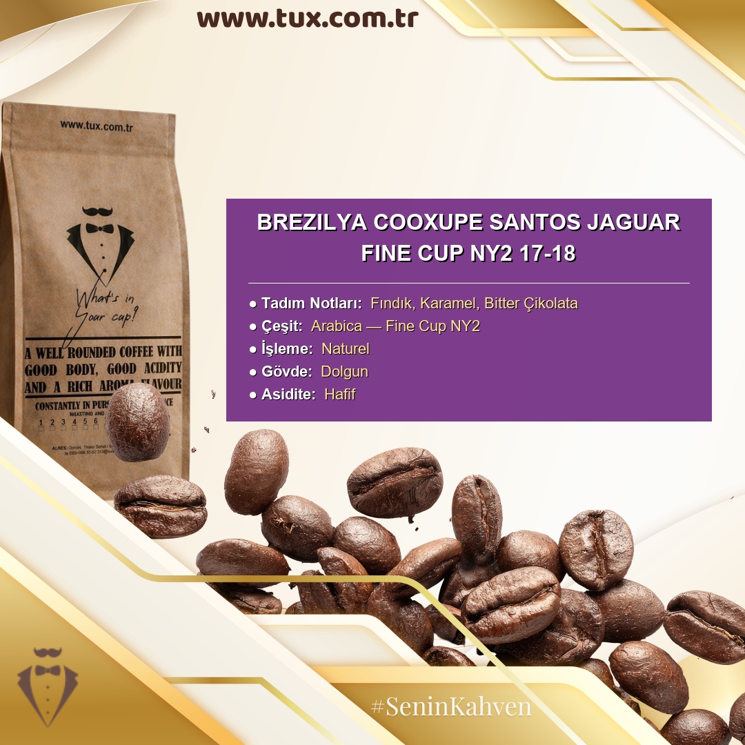Brezilya Cooxupe Santos Jaguar Fine Cup NY2 17-18 — Tux Atölyesi'nden Taze Kavrulmuş Toptan Kahve